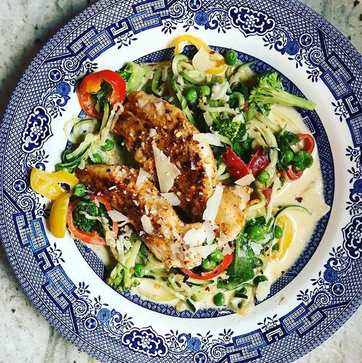 - Drizzle the heavy cream over the mixture and add the chicken back in, nestling the tenders between the zoodles and veggies.