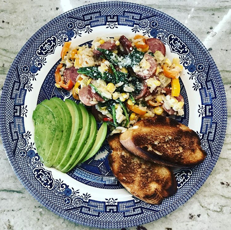 A skillet for me involves meat of some kind, veggies and a starch. Today, based on my options I made a kielbasa skillet with veggies and white rice. I can give the low-down on my version featured above, but remember you can make your own skillet at home using what you have leftover. Just keep this simple equation in mind: cooked meat + lots of fresh veggies + a starch like rice, pasta or potatoes = helluva good skillet dinner!